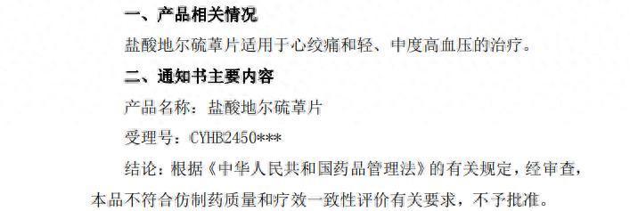 亚太药业表示,本次盐酸地尔硫䓬片不予批准不会对公司当期业绩产生重大影响,后续公司将完善该药品的相关试验研究工作后重新申报申请。药品研发具有周期长、环节多的特点,容易受到一些不确定性因素的影响。